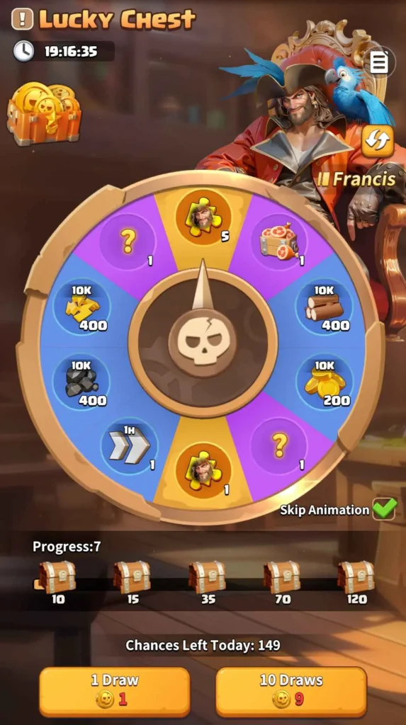 In the Lucky Chest event, you need “Skull Coins” to spin the wheel. There are many great rewards available on the wheel, and each one has a different chance of being landed on. You also receive a free Skull Coin every day, which means you can get a free spin every day.